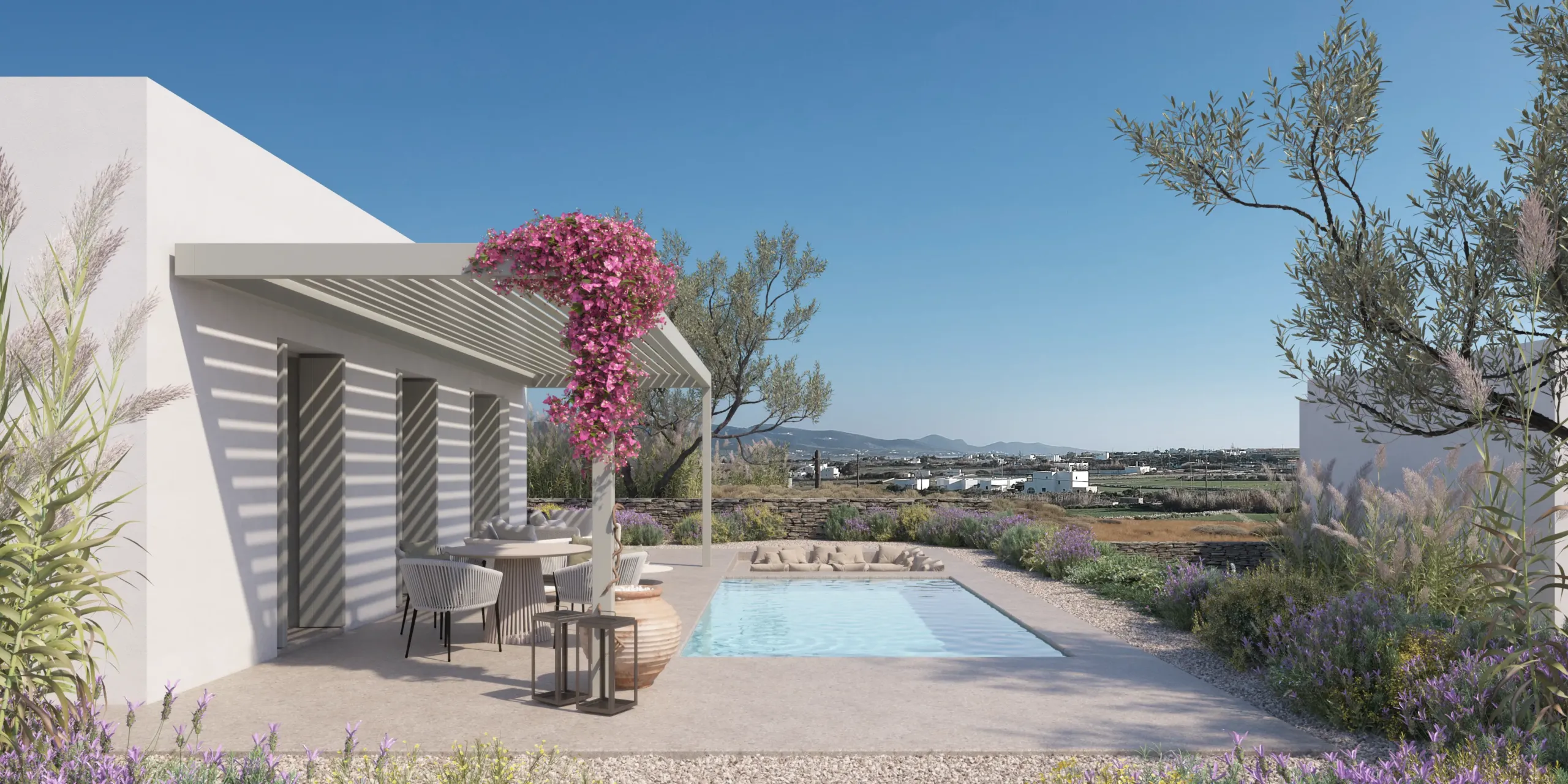 Located in western Paros near Pounta, Within the city plan, overlooking the sea, Antiparos island & the sunset. 600m from the sea, 2km from the port of Pounta, 6km from the airport, 7 km from the port.