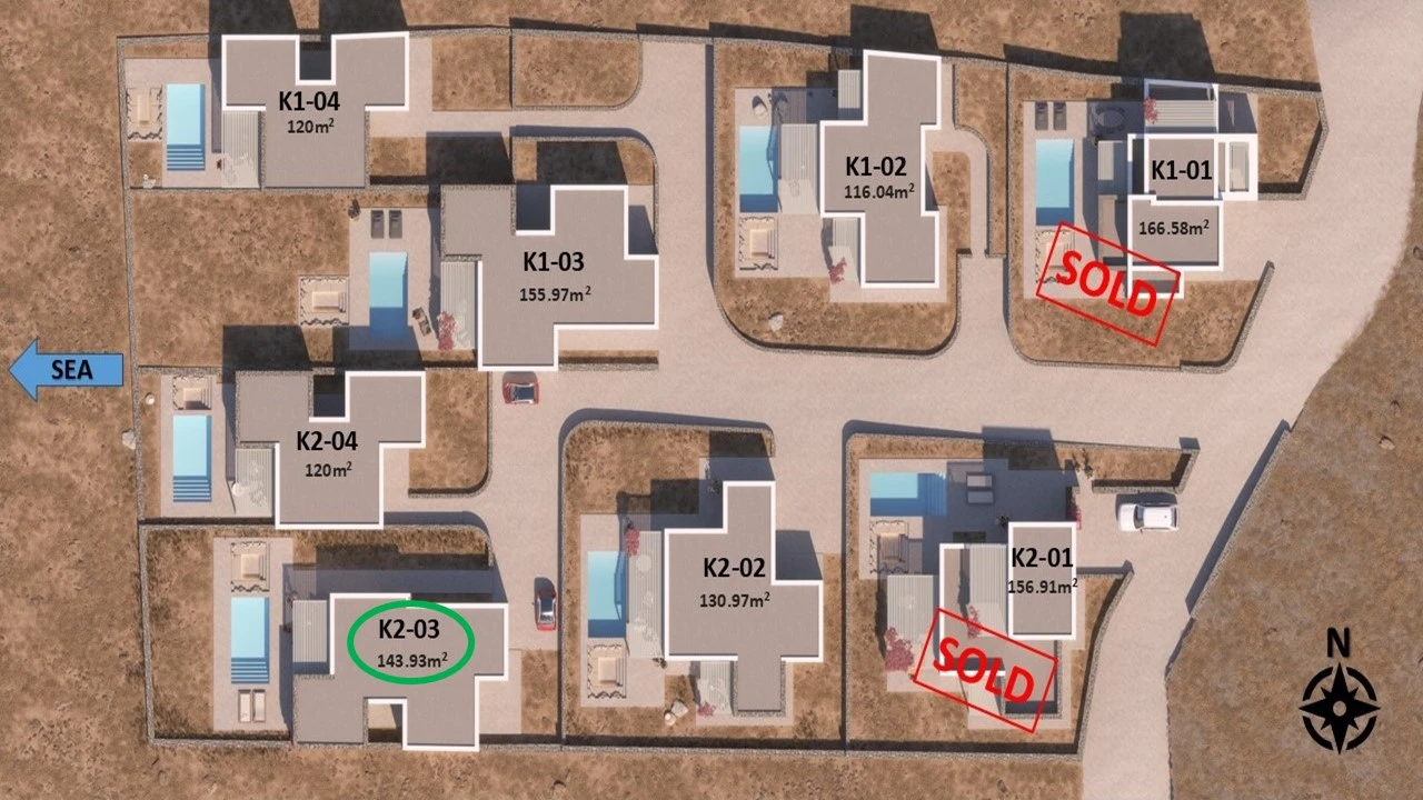Located in western Paros near Pounta, Within the city plan, overlooking the sea, Antiparos island & the sunset. 600m from the sea, 2km from the port of Pounta, 6km from the airport, 7 km from the port.